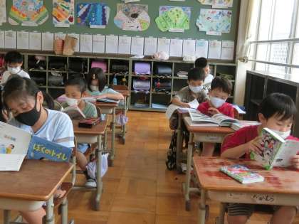 2年生では,全員年間100冊読書を目指しています。たくさん読書を行い,読書ノートに記録しています。友達どうしで,おすすめの本について話すなど,本に興味をもっています。