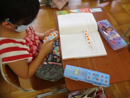 たしざんの学習です。今日は,「あわせていくつになるか」を式にしました。+と=の記号も書けるようになりました。