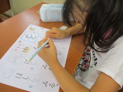 今日は,ひらがな「を」です。言葉と言葉をつなぐときにしか使わないので,いつものひらがな練習とは形式が違い,驚いていました。