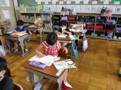 「くちばし」の学習です。みんなで音読した後,クイズを作りました。昨日選んだ動物などの写真を使って問いの文と答えの文をノートに書きました。明日,クイズ大会です。