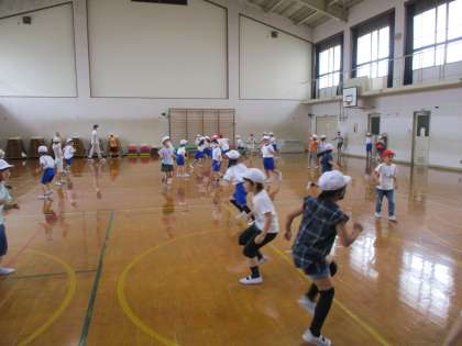 中間休みに,2年生とバナナおにをしました。いっぱい走ってにこにこの1年生でした。2年生ありがとう!