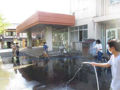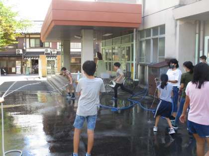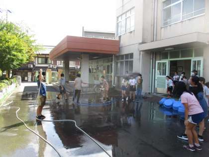 みんなで水かけをして遊びました。