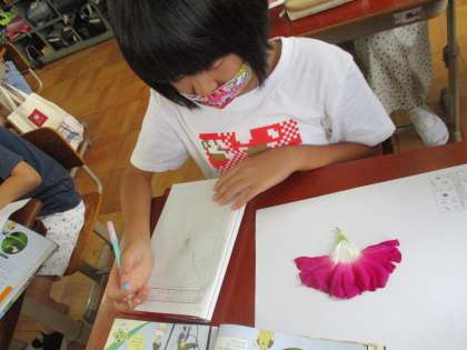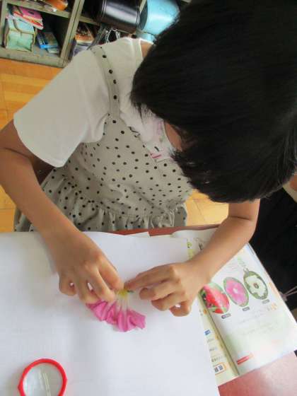 一人ずつアサガオの花を開き,花の中のつくりを観察しました。ノートにスケッチをし,気づいたことをまとめました。花は,がく,花びら,おしべやめしべなどの部分からできており,おしべやめしべの先の粉のようなものは,花粉ということを学びました。次回は,花粉の様子を顕微鏡で調べます。