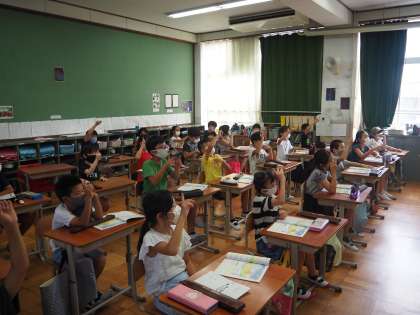 8月28日(金)4年生の音楽の授業です。テーマは何拍子?みんな自分の指を動かして,指揮者になったつもりで拍を刻みます。コロナ禍の中で音楽の授業も工夫が必要になってきます。