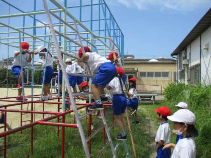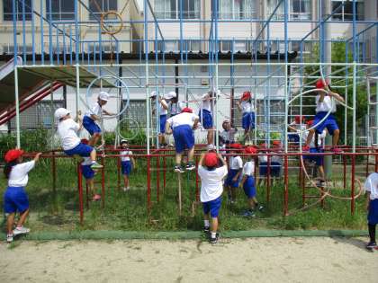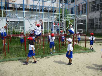 昨日より,遊具を使用できるようになりました。今日は,体育の学習で「ゆうぐあそび」をしました。親指を下にして遊具をしっかりもつことや3点で支持することなど約束ごとを学習したあと,総合遊具に上ってみました。ちょっぴり怖い様子も見られましたが,約束を守って遊ぶことができました。