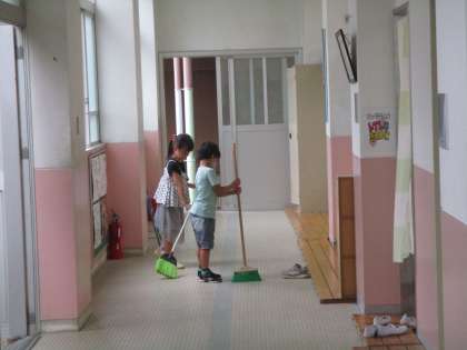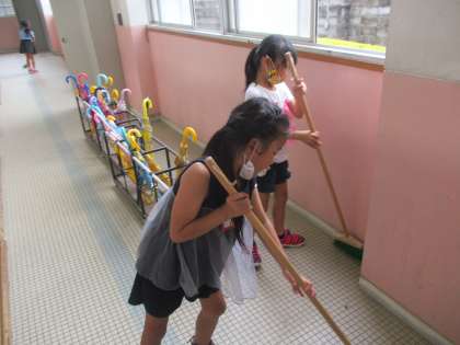 廊下の掃除もがんばっています。今日は傘立てを動かしてはきました。分担をして上手にはけました・。