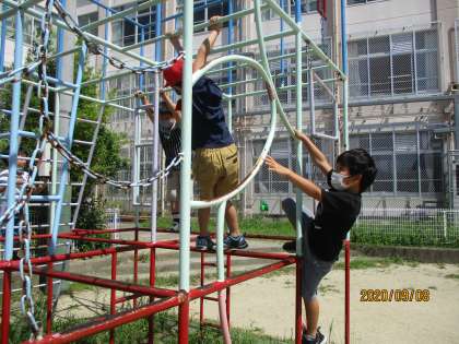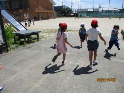 給食が終わると,外に出て「逃走中しよう!」と駆け出していきました。暑いけれどにっこにこで遊んでいます。