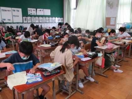 今日は「本返しぬい」をしました。練習布の印をたよりに,どの子も慎重にぬっていました。最後の玉どめも慣れてきたようです。できた子は,まだの子にコツを上手に伝え,一緒にやっていました。初めてなのにとても上手にぬうことができていたのでびっくりしました。教育実習生の先生も教えに来てくれました。
