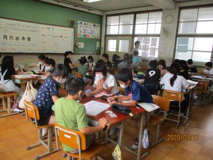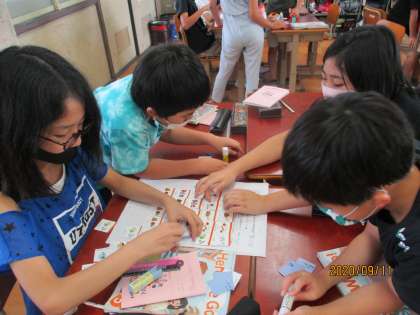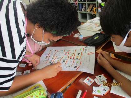 時間割のたずね方や言い方を学習しています。学習のまとめは,班ごとに作ったオリジナル時間割の発表です。どの班も何の教科にするか,またスペシャル科目は何にするか楽しく相談しました。分からない単語は,アマダラ先生が発音とつづりを教えてくださいました。来週の発表が楽しみです。