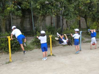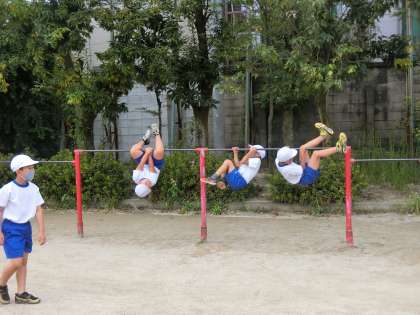 2年生の体育では,鉄棒を始めました。今日は今できる技の確認を行いました。自分たちができる技を友達と見せ合って,楽しそうに取り組みました。