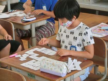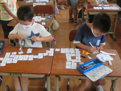 2年生の算数では,線路づくりを行いました。限られた枚数を使い,ぐるっと回る線路ができるように考えました。そのあとは,友達と協力してもっとたくさんの枚数を使って線路づくりを行いました。
