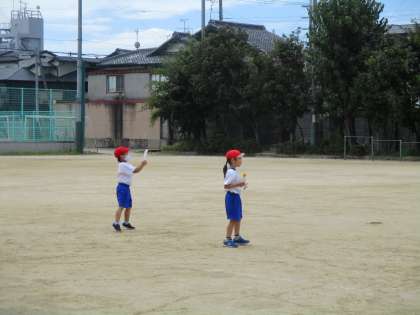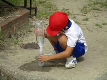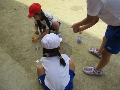 体育の後,生活の学習をしました。少し季節はずれてしまいましたが,暑い日にすると気持ちよい遊びの一つ,水遊びをしました。ペットボトルや容器に水を入れて水を遠くまで飛ばしたり,どろだんごを作ったりして遊びました。すごく楽しそうでした。