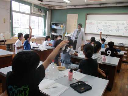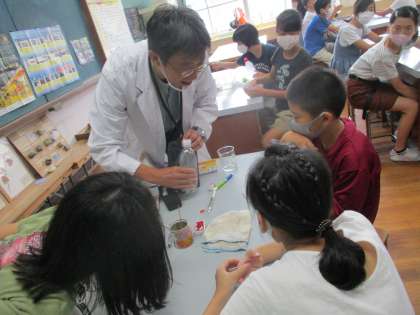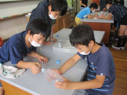 雲の学習の流れで,校長先生の特別授業がありました。テーマは「雲をつかもう」です。500mlペットボトルに少量の水を入れ,お線香の煙を閉じ込め,手で強くつかんだり,ゆるめたり・・・その変化を観察しました。実験の結果,体積が膨張する時に温度が下がり,水蒸気が水滴になる,それが雲であると分かりました。難しい内容ですが,頭を使って考える子どもたちは,とても生き生きしていました。学ぶことの楽しさを感じていたように思います。