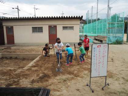 今まで草に覆われ,見る影のなかった造形砂場。いつのころからか,子どもたちがスコップで掘り返し,埋まってい固くなった砂を出し,草を抜き,きれいにしてくれました。これから,新しい砂を入れて,造形砂場を復活させます。子どもたちも,先生がやりなさいといったわけでもなく,スコップを持ち,草を抜き,砂場のかたちが変化していく様子を楽しんでいたようにも感じます。砂が入って,リニューアルした造形砂場が楽しみです。