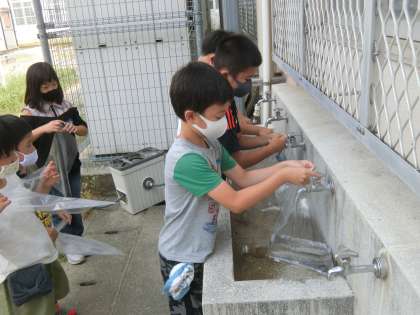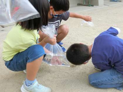 2年生の算数では,かさの学習を行っています。自分で1Lを予想して袋に水を入れました。実際に量るととてもたくさん,袋に入っていたようで驚きの声があがっていました。