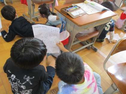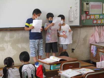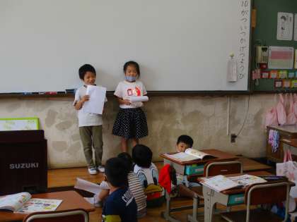 周りの音を声にして表現する学習です。今日は,見つけた音を友だちと「よびかけ」「こたえ」になり交流しました。前に出て発表もしました。いろんな音が聞こえてきておもしろい学習になりました。