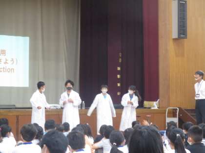 校長先生と六年生の代表が全校のみんなの前で実験をしている様子です。