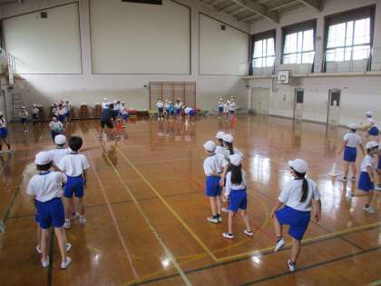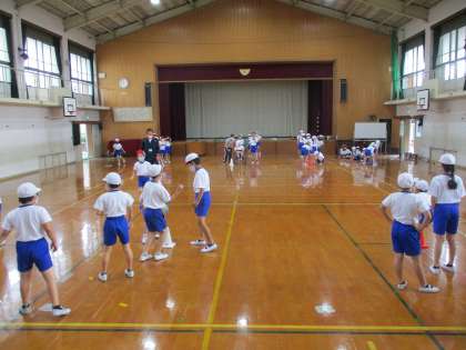 20日の体育科学習参観日に向けて3・4年生が一緒に練習をしました。途中で,どうしたらうまくいくかグループで相談しながら練習をしていました。