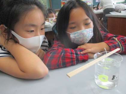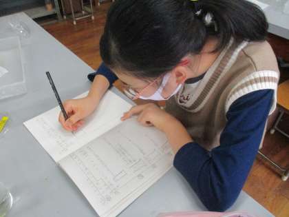 ものが溶けるとはどういうことだろう?という学習問題を立て,考えを予想し,実験をしました。食塩や飴が溶ける様子を観察し,ノートに結果や考察をまとめました。次回は,目に見えないけれど溶けたものが消えたわけではないことの説明を考えます。