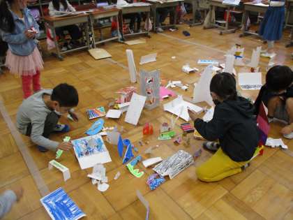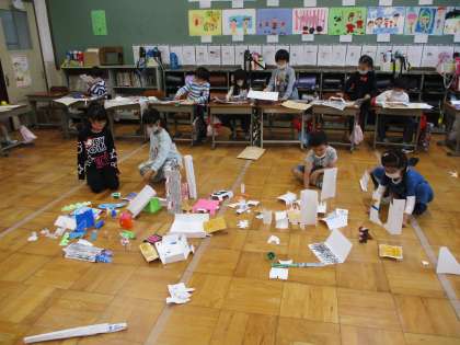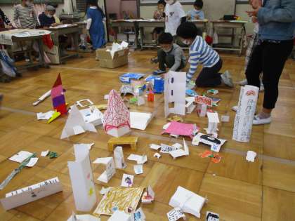 作品をどんどん並べると,さらに作りたいものが浮かんできて,海,山,東京タワー,マンション,お城,すもうとり,いろいろな動物などたのしい町ができました。