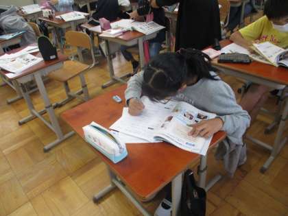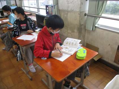 紹介する人物のできることや出身地,性格などを英語でワークシートに書いてる様子です。