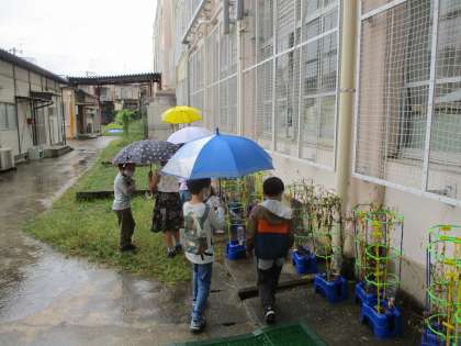 台風接近のため,植木鉢を校舎内にお引越ししました。雨が降っていたので,お友達と協力しながら移動しました。