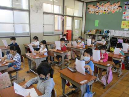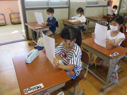 今日から目の体操週間です。1から12までの数字を曲に合わせて目で追いました。まずは,練習をしましたが,目ではなく頭を動かすかわいい1年生たちでした。