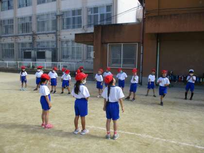 今日は一年生だけで体育をしました。まずは,体育係が前で体操をしてくれました。