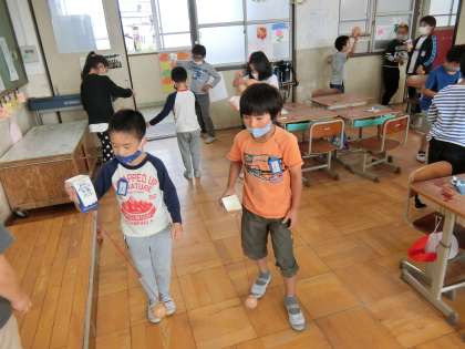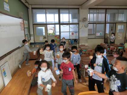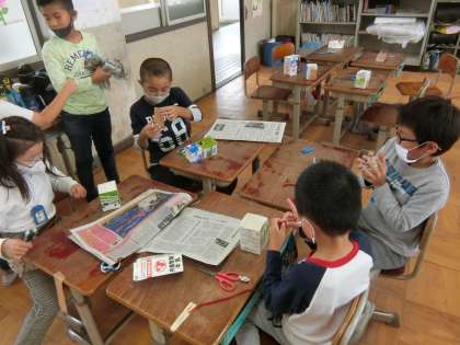 生活科では,家庭にあるものを使いおもちゃ作りをします。今日は第一弾として,全員でけん玉を作りました。班で協力しながら完成させることができました。できあがったけん玉でみんなで遊びました。