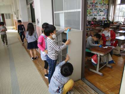 「先生の机は,教室の扉から廊下に出せるかな?」机を動かさずに離れたものの長さを比べるにはどうしたらいいのだろうとみんなで考えを出し合いました。たくさんの意見を交流して,長さを紙テープに移し替える方法を思いつきました。