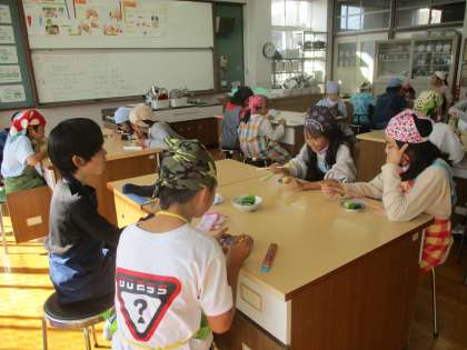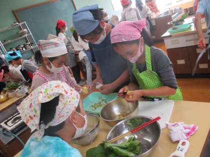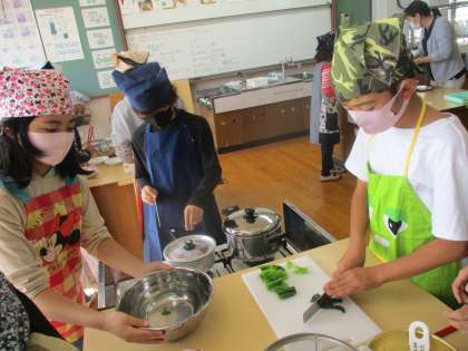 小松菜とじゃがいもをゆでる実習をしました。班で協力して調理をし,おいしく味わいました。ふりかえりでは,野菜によってゆで方が違うこと,加熱前と後では固さや色が変化することなど気づいたことをまとめました。