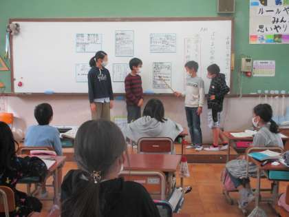 話し合いの学習をしています。議題は「どうしたら授業が楽しくなるか」です。今日は,班ごとに話し合ったことをみんなで共有し,意見を交流しました。それぞれの班ごとに面白い意見が出て,いろいろな考えがあることが分かりました。また,まとめることの難しさにも気づいたようでした。