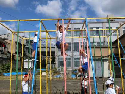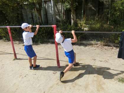 2年生の体育では,鉄棒に取り組んでいます。何度も,練習し逆上がりができる人が増えてきました。お互いに見合って,アドバイスをする様子が見られます。また,遊具を使った学習として,うんていやのぼり棒の練習も行っています。今後も頑張って,練習してほしいと思います。