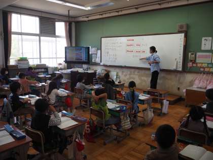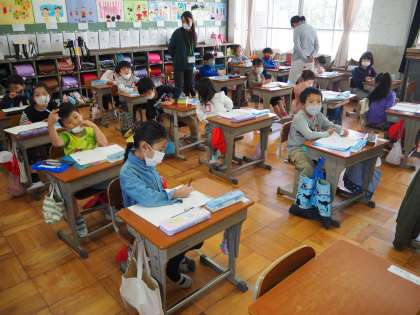 10月26日(月)1年生の算数の授業です。二つの数値の足し算から,三つの数値野足し算の方法を学びます。式の立て方,答えの出し方をノートに書いていきます。1年生もノートがしっかり書けるようになってきました。