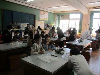 前回の実験で使った食塩水をろ過し,蒸発させて食塩をとりだす学習をしました。漏斗の使い方も知り,どの班も食塩をとりだすことができました。