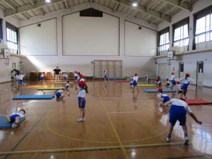 マット遊びの学習が始まりました。今日は準備をしたり,約束のお話を聞いたりしました。