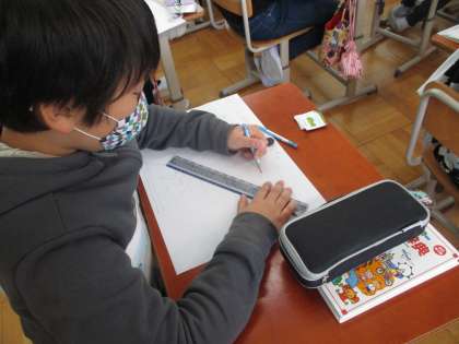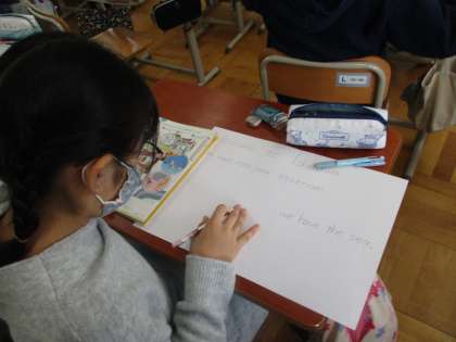 自分が選んだ都市を英語で紹介するポスターを作っている様子です。