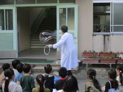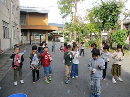 昨日の朝会で見せてもらったしゃぼん玉の実験を,1年生にさせてもらいました。一人ひとりしゃぼん液とストローを持ってたくさんのしゃぼん玉を作りました。