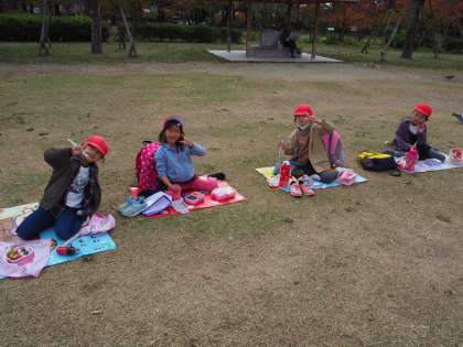 楽しみにしていたお弁当タイム!みんなで水族館の方を向いて,シートをくっつけないように気をつけて準備をしました。おなかをすかせたハトが近づいてくるので,大切なお弁当を取られないように守っていました。大きなおにぎりや,大好きなおかずににこにこの1年生でした。お弁当や準備,ありがとうございました。