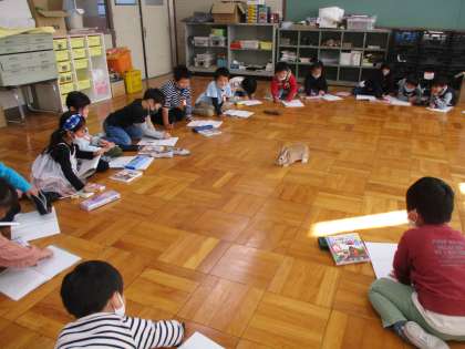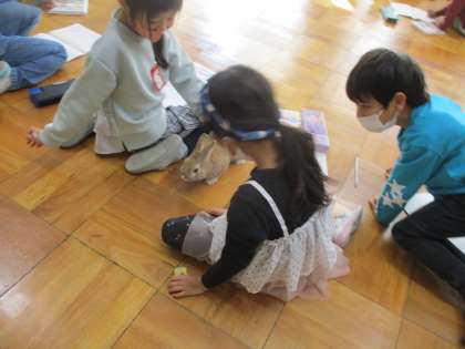 知らせたいことをくわしく文章にする学習です。今日は,うさぎのモモちゃんを観察しました。モモちゃんが動き回るので,近寄ってくるとすごくうれしそうにしていました。でも,みんなが大きな声を出すので,ちょっぴり震えていたモモちゃんでした。