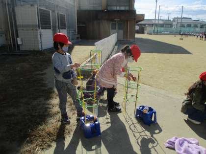 あさがおのつるを使ってリースを作りました。つるを上手にまとめて輪にすることができました。明日はかざりつけです。