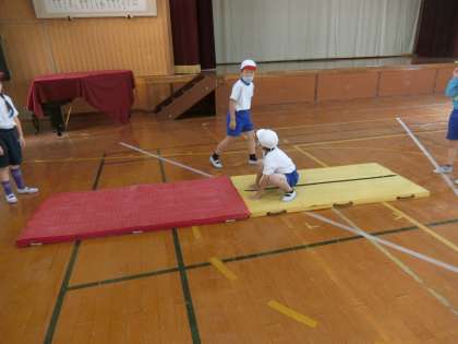 2年生の体育では,マットを使った学習が始まりました。はじめは,準備や片付けのやり方を確かめ,そのあとは班で活動しました。1年生の時にできていた技をたくさん見せてくれました。