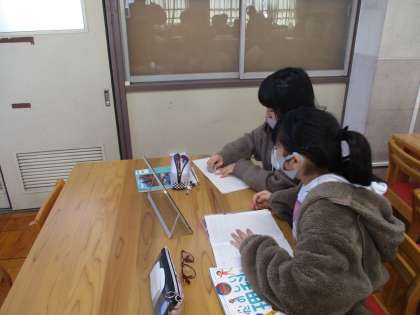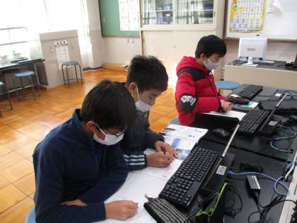 タブレットを使って調べ学習をしている様子です。