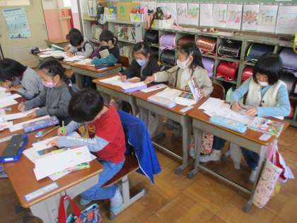 「くだもの」や「花」などの名前を集めてお店をすることになりました。「一つ一つの名前」を考えてカードに書いています。