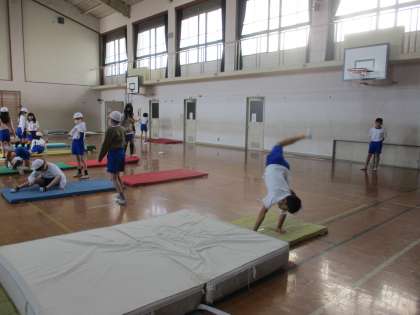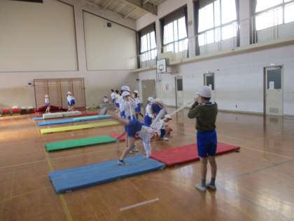 できる技の連続や新しい技の練習に励んでいます。友達と協力し,アドバイスをし合いながら進めています。