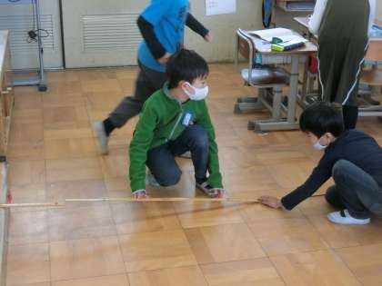 1mの竹尺を使い,長い距離を測りました。教室の縦や横の長さを測る時は声を掛け合い,協力できました。