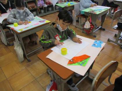 この間,紙の形から考えて絵にしたものを画用紙に貼りました。楽しい作品ができました。