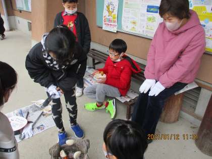 朝から小雨降る寒い日でしたが,子ども達が楽しみにしていたもち焼き体験がありました。地域の方にお世話になり,『七輪』を使ってお餅を焼いて食べました。マッチの擦り方から,火のおこし方までていねいに教えていただき,いつもとは一味違うお餅をいただきました。『七輪』でお餅を焼いた後,「とてもおいしかった!」「おもちのふくれ方がよく分かった。」など感想を発表していました。「時短」で焼くのと違って,昔のようなゆっくりした時間が流れていました。