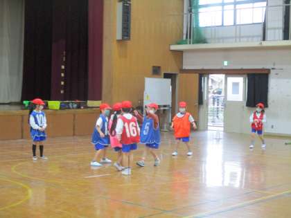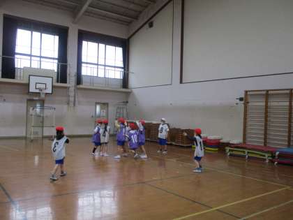 パスゲームの試合をしました。ボールを持った人は,歩いてはいけないルールです。うまく味方にパスを渡すためには,同じチームのボールを持っていない人が動かないといけません。けれど,味方がボールを持つと,なぜかみんなその場に止まってしまいまう,かわいい1年生です。