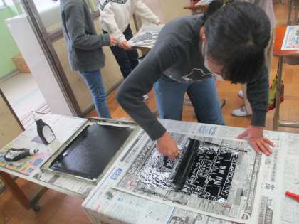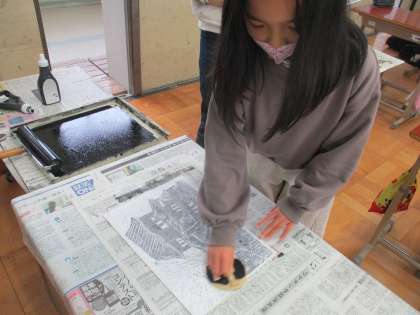 お城や寺社仏閣を題材に,版画を作成中です。彫り終わった順に,一人二枚刷りました。ドキドキしながら慎重にインクをつけ,和紙を置き,こすると・・・白黒がきれいな作品が次々と出来上がりました。次回は,背景に色をつける予定です。